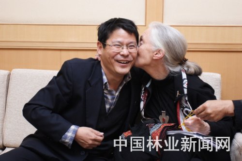 像在之前许多年的深秋一样,今年,珍·古道尔博士再次来到我们身边。此时是她在世界各地巡讲、来到中国的时刻。 11月6日,珍·古道尔来到北京市景山学校远洋分校。虽然学校远在京城西部的石景山,但照例座无虚席,济济一堂,隆重而热烈。的确,无论在哪儿,珍·古道尔所到之处都如同过节一般。 于我而言,今年,根与芽北京办公室工作人员贴心地把我作为珍博士的嘉宾“粉丝团”成员之一,给我们安排了跟珍博士单独会谈与合影的环节,真是莫大的荣幸。而与多数人不同的是,我与珍博士每次见面,都会施行一下西式的拥抱礼,可惜没什么人给我们抓拍个好照片。今年,幸亏带夫人来了,擅长摄影的她,及时拍下了我和珍博士相互拥抱的难得瞬间。 真是令人惊异,掐指一算,自1998年在北京麋鹿苑认识珍博士,我们已经相识18个年头了!可以说这些年,我从事业到生活,都不乏受她影响的地方,而且受益匪浅。 我们的相识,缘于黑猩猩。但不同的是,当年,她是在野外研究保护黑猩猩,我只是饲养笼中的黑猩猩。在她面前,我是“小巫见大巫”。不少听过我讲座的朋友们都知道,我常常在科普活动时,戴着黑猩猩的面具,讲述人与动物关系的故事,这其实是受到珍博士的启发:她每次演讲,总要以黑猩猩的叫声开场。我们都是自然教育者,为了共同的绿色未来,她全球各国,我全国各地,奔走呼唤。 为了自然保护,80多岁高龄之人,一年到头如同“空中飞人”,满世界巡讲。在讲座中,她抑扬顿挫、娓娓道来,为黑猩猩等野生动物代言。她的这种“精、气、神”,从智力到体力,作为如此年龄的老人,简直令人不可思议。 1998年,我刚从北京濒危动物中心调到麋鹿苑工作。那年秋末,珍博士来到中国,在当时国家环保总局宣教中心贾峰副主任带领下,到了麋鹿。因我之前也与黑猩猩相伴,现在又做环境教育,类似的经历,让珍博士给了我很多保护思想与科普技巧方面的指导。 记得那时麋鹿苑的科普设施几乎空白,如何制作和开展立意深远的自然教育,让初来乍到的我几乎无从下手。珍博士耐心地教我,最典型的就是辅导我做一个箱子,门上写“这里有一种最可怕的动物”,打开一看,里面却是照见自己的镜子——我心领神会。当晚,我将做好的小样带到她演讲的环保宣教中心,得到了她的赞赏。