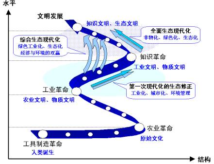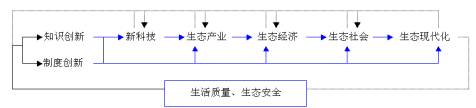 4、广义生态现代化的动力 生态现代化是一个非常复杂的过程,它受到许多因素的影响。有些影响因素是限制因素,有些影响因素是动力因素。生态现代化的动力因素,来源于国家的各个方面。 (1)广义生态现代化的动力模型 (2)广义生态现代化的动力原理 生态现代化的创新驱动模型。现代化的创新驱动模型,同样适用于生态现代化,也是生态现代化的创新驱动模型(图2-18)。简要地说,在生活质量和生态安全需要等的推动下,发生生态相关的知识创新和制度创新,它们推动了新科技、生态产业、生态经济和生态社会的发展,进而促进生态现代化的进步;全过程每一步都有反馈调节,形成循环推动的反馈环。