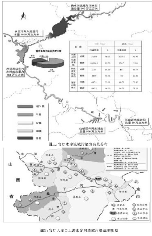 其污染物分布和贡献率为:官厅水库主要污染物质是氨氮、COD和总磷;年入库污水总量为9328万m3。其中永定河入库8600万m3,妫水河入库540万m3,库区周边188万m3;山峡区年污水排放506万m3;官厅水库污染物贡献率分布为点源65%~70%、面源20%~30%、内源(底泥)5%~10%。