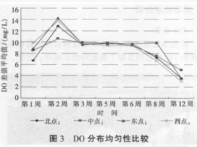 2.3.3监测项目 监测项目为水温、pH、DO、透明度、TP、TN、NH3-N、CODcr、叶绿素-a。水温、pH、DO采用便携式测速仪器测定,TP、TN、NH3-N、CODcr等项目采用实验室测速方法测定。 3试验结果分析 3.1DO变化 水质净化系统安装后,4个监测点在中层和底层水体的DO变化均出现了相似的增长规律。可见,水质净化系统对于提高中层、底层水体的DO具有一定的作用。 3.1.1不同深度水体的DO随时间的变化 (1)中层水体。4个监测点中层水体的DO初始值为2.4-3.7mg/L,后期多次监测平均值为6-15.5mg/L,北点、中点、东点、西点的增长率分别为274%、399%、381%、317%。可见,随着时间的延长,中层水体的DO呈逐渐上升的趋势,说明是水质净化系统作用的结果。 (2)底层水体。4个监测点底层水体的DO初始值为0.13-0.21mg/L,后期多次监测平均值为0.54-0.73mg/L,北点、中点、东点、西点的增长率分别为300%、290%、382%、558%。可见,随着时间的延长,底层水体的DO呈逐渐上升的趋势,说明是水质净化系统作用的结果。 3.1.2均匀性比较 通过比较DO在不同深度水体中的分布情况,来说明系统对改善DO在水中分层现象的作用效果。将各监测点表层与中层、中层与底层水体的DO差值进行平均,用来表征DO在水中的均匀程度,差值越大,说明分布越不均匀;差值越小,说明分布越均匀。