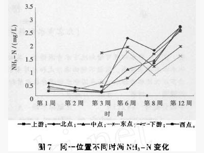 如图6所示,随着时间的延长,各监测点水体中的TP的变化基本呈现相似的规律,在水质净化系统安装后至第3周的时间内,各点的浓度均有不同程度的下降,下降幅度为45%-71%,并在第3周时达到最低点,各点数值基本重合;在第3周到第12周内,各点TP出现上升、下降的曲折变化,以北点上升幅度最大,东点、西点次之,中点与上游、下游类似。从监测后期上、下游和各测点的TP出现的较大差异来看,说明水质净化系统对TP基本没有去除率。 3.7NH3-N变化 同一位置不同时间NH3-N变化如图7所示,在系统安装后第1周到第3周,除东点外,其他3点的NH3-N均出现不同程度的下降,下降幅度为25%-64%。第3周到第12周,各监测点同上游、下游水体的变化趋势相同,呈曲折或直线上升,其原因应是人河污水产生的影响。从第3周各点NH3-N的数值来看,试验区上游数值与各监测点类似,试验区下游远远高于各监测点数值,可以说明水质净化系统对水体中的NH3-N有一定的去除率。 4结论 (1)水质净化系统安装后,有效改善了试验区内水体表层富氧、底层缺氧的状况,各点水中的DO含量均有一定程度的提高,增长幅度为270%-400%,表、底层DO分布日趋均匀。 (2)水质净化系统安装后,有效缓解了藻类在水体表层大量聚集的现象,水体中叶绿素的分布日趋均匀。 (3)与试验区上游、下游相比,水质净化系统对水体的透明度、COD、TN、TP等基本没有去除效果,对水中NH3-N有一定的去除效果。 作者简介:许志兰(1978一),女,助理工程师。 |