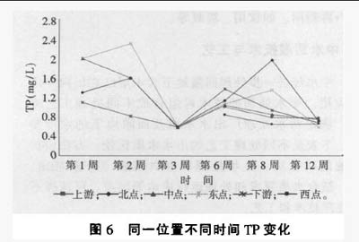 3.4COD变化 随着时间的延长,各点水体中的COD浓度均呈下降趋势,下降幅度为46%-70%。比较水质净化系统安装后第6周到第12周各点对COD的去除率,发现除下游外,其他各点对COD去除率没有明显差别(去除率相差不超过6%),说明水体中各点的变化是河流自然降解和水体净化系统共同作用的结果,水质净化系统单独对水体中COD基本没有去除。 3.5TN变化 随着时间的延长,各点水体中的TN浓度均有不同程度的下降,下降幅度为25%-36.3%,比较各监测点与上游、下游对TN的去除率,发现没有较大差别(去除率相差不超过10%),说明水质净化系统对于水体中TN基本没有去除效果。 3.6TP变化