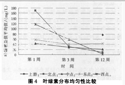 如图3所示,随着时间的延长,各监测点DO的差值平均值均呈现上升、下降、持平、再下降的变化曲线。DO上升应是系统运行初期,水流搅动底泥对DO影响的结果。各点下降幅度类似,第12周时的差值平均值是第2周的0.3-0.6倍,说明DO在水中的分布越来越均匀。 3.2叶绿素变化 水质净化系统安装后,在一定区域内营造出了水体的垂直流循环,藻类在水体中的分布日趋均匀,通过比较叶绿素在水体中的分布情况,来说明藻类随时间的变化。将各监测点表层与中层、中层与底层水体的叶绿素差值进行平均,用来表征叶绿素在水中均匀程度,差值越大,说明分布越不均匀差值越小,说明分布越均匀。