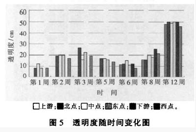 如图4所示,随着时间的延长,各监测点叶绿素的差值平均值均呈下降趋势,下降幅度最大的点为西点、北点,第12周时的差值平均值分别是第2周的0.02和0.06倍,说明藻类在水中的分布越来越均匀。 从空间分布来看,第12周时,水质净化系统安装位置上游水体中不同深度的叶绿素值差异较大,差值平均值达76.7mg/L,即分布极不均匀北点、中点、东点、西点的差值平均值分别为9.5、20.9、42.7、2.7mg/L。可见,经过水质净化系统的作用,各监测点的不同深度叶绿素值均有不同程度的减小。 3.3透明度变化 水质净化系统安装后,水体透明度随时间的变化如图5所示,可以看出,各监测点的透明度总体呈上升趋势,中间出现小的反复。第1周到第3周出现一个小的增长,从8-12cm增长到16-26cm,之后透明度下降、再上升,第12周各监测点增长至50cm左右。透明度的上升与下降,是河流水体的自然降解作用和水体净化系统产生的表面流的综合作用结果,其中也包含水位下降、降雨径流等因素的影响。 比较各监测点与上游、下游的透明度,可以看出,各点数值没有较大差异,因此,水质净化系统安装对于水体透明度的提高没有明显作用。