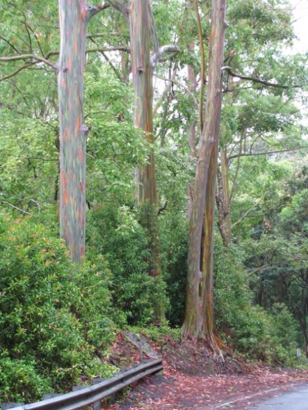 这种与众不同的彩色现象因树皮在不同时间脱落所致。不同颜色代表树皮的不同年龄。新脱落的外皮所在位置由亮绿色的内皮取代。随着时间流逝,树皮颜色逐渐变暗,由蓝色变成紫色,而后又变成橙色和栗色。