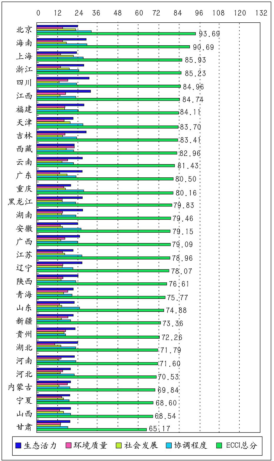 二、评价结果 根据我们的评价指标体系,我们对各省2005年至2007年的生态文明建设情况进行了综合评价。2008年及以后的评价结果,我们将在国家有关权威数据发布后,根据数据丰富程度的提升和理论研究的深入,对评价指标和评价方法进行必要的调整,每年向社会公布。限于篇幅,这里仅列出2007年的评价结果(见图1)。 需要说明的是,评价结果中的各项分数只是相对得分。每一项指标及总指标的最高分和最低分,分别是由当年各省每项指标的原始数据中的最高值(被赋予最高等级分6分)和最低值(被赋予最低等级分1分)确定的。根据这种相对评价算法,如果一个地区全部22项指标均名列全国第一,总得分是132分,不是100分;全部指标均名列全国倒数第一,总得分是22分,也不是0分。根据生态活力30%、环境质量20%、社会发展20%、协调程度30%的权重分配比例,各二级指标的得分上限分别为39.6、26.4、26.4、39.6分。 由于受到自然条件、社会发展水平、科学决策、投入力度等因素影响,各个省份在2005年、2006年、2007年的ECCI得分显示出一定的差别,北京、上海、海南、天津、福建、浙江、四川等省份排名居全国前列,山西、甘肃、宁夏、贵州、河南、河北、内蒙古等省份却排名相对靠后。目前来看,全国各地生态文明建设仍然任重道远,所以即使某省得分很高,排名靠前,也只表明该地区在全国当年的生态文明建设中比较领先,并不意味着已经实现了生态文明建设的最终目标。 由于ECCI采取的是相对评价法,因此各省ECCI得分排名上升,既可能是自身努力建设的结果,也可能是其他省份建设水平相对下降造成的。因此,我们还专门对各省的进步率进行了分析。我们以22个三级指标的原始数据为基础,用后一年的值除以前一年的值,减去1,再乘以100%,得出每一项具体指标的年进步率;各二级指标的年进步率,以相应三级指标进步率之和除以相应指标项数得出;总进步率则以相应二级指标进步率之和除以相应指标项数(4项)得出。其中,正百分率代表进步,且正百分率越高表示进步率越大;反之,负百分率代表退步,负百分率越高表示退步率越大。由上述算法可知,进步率不是省间比较的结果,它表示各省生态文明建设状况的实际变动。如果以切实推进生态文明建设为目标,促进实际进步比提升相对排名更为重要。 课题组以2005、2006、2007三年的原始数据为基础,对各省的逐年进步率进行了测算。结果表明,除了个别省份在生态文明建设整体水平上有退步外,各省生态文明建设整体水平进步显著,最大总进步率超过了16%,成绩喜人。其中三年间进步率较大且相对稳定的是西藏、上海、山东、吉林、安徽、福建,这些省份分别属于不同的得分等级,这就说明,进步率尽管受到生态文明建设的自然条件基础和社会发展基础的影响,但主要依赖于当地政府的重视程度、建设投入力度和科学决策。 从各个二级指标的进步情况来看,生态活力、社会发展的进步程度幅度较小且相对稳定,而环境质量和协调程度的进步率变化相对较大。其中,绝大部分省份的社会发展水平和生态活力均稳步提升;尽管有些省份在环境质量上有30%以上的显著上升,但也有个别省份的退步率达到15%以上,且环境质量退步的省份面较大,占一半左右;在协调程度方面,个别省份进步程度高达60%以上,一批省份进步率超过10%,特别要注意的是,在2006年,尚有十余省份的协调程度较2005年水平有退步,但2007年,所有省份均在协调程度上有进步,且幅度较大,这预示了全国生态文明建设的良好趋势。 三、相关性分析 为了检验指标体系的合理性,弄清楚各级各类指标在指标体系当中的意义及相互关系,我们选用斯皮尔曼(Spearman)等级相关,并采用双尾检验的方法,对各年度数据作相关性分析。 1.二级指标的相关性 通过分析三年二级指标与总指标之间的关联度以及各二级指标之间的关联度,发现协调总分、社会发展、生态活力这三个二级指标都与ECCI总分有很高的关联度,而环境质量则相对独立。但环境质量并非无关联变量,其分数和协调程度存在一定关联,因此,环境质量作为相对独立的二级指标,尽管与加权总分之间的关系非直接线性,但可能作为中介或者关系变量,通过其他指标对总分施加影响。各个二级指标之间,除了社会发展与协调程度之间有比较高的正相关外,其他二级指标之间均无相关或相关不显著,这显示出二级指标一定程度的相对独立性。总之,各二级指标均与ECCI总分关联紧密,且相互之间相对独立,这说明指标体系的结构框架和权重分配是合理的,能够确保测评结果的客观性和准确性。 生态活力与ECCI加权总分之间存在显著正相关性,表明生态良好不仅是生态文明建设的基础,且是生态文明建设的强大杠杆。像海南、江西、四川、吉林等生态大省,其优良的生态条件对于整体的生态文明建设水平有很大的促进作用,而甘肃、山西、宁夏、内蒙古、河北等省份,较弱生态活力直接制约了生态文明建设水平。北京、天津、上海等直辖市,其相对高的社会发展程度弥补了生态活力的不足。 目前来看,环境质量相对独立,与ECCI总得分之间不存在显著关联。但分析发现,环境质量最靠前的10个省份都是社会欠发达地区,而环境质量较差的地区既包含社会较发达地区,也包含社会欠发达地区。这说明在一定发展阶段,社会发展有可能降低环境质量,但生态文明建设
