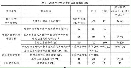 二是组织建设得以加强。十一届全国人大一次会议批准组建环境保护部,强化了统筹协调、宏观调控、监督执法和公共服务等职能,为推进环境保护历史性转变提供了更加有力的组织保障。其后的地方机构改革中,环境保护部门也都成为地方政府的组成部门,这使环境保护部门的话语权和政策协调能力得到大幅加强。 三是主体功能区划使环境保护与经济发展的关系更易于协调。《纲要》提出的优化开发、重点开发、限制开发和禁止开发四类主体功能区,是基于不同区域的资源环境承载能力、现有开发密度和发展潜力,以是否适宜开展大规模、高强度工业化和城镇化开发为标准划分的。根据不同主体功能区的定位等,制定差别化的财税、产业、土地、人口政策和领导干部政绩考核标准,这样,四类主体功能区划可使各地合理利用环境容量,实现协调发展。这既是优化经济布局、促进区域协调发展的战略举措,更是保护生态环境的一项基础性、长远性的根本措施,也为强化环境保护参与宏观调控及在环保工作中分类指导提供了手段。 这三方面机遇,不仅有利于直接的环境治理,也有利于促进资源节约、环境友好型社会的建立——其在环保上的要求涉及多个部门,容易使各部门共同营造有利于环境保护的工作背景。 (三)环境保护工作的重点问题 环境质量也是民生要素,中华民族完成伟大复兴不可能没有良好环境的依托。但中国目前的发展阶段和环境质量不佳导致的现实问题使中国在环境保护和生态建设上需要解决的重点问题很明确:优先解决危害人民群众健康的环境问题,确保全面小康中包括“环境质量改善带来的健康”。至于气候变化以及全球环境治理的要求,在“十二五”这样的近期暂时不作为环保工作的重点而更多将其从外交、外贸层面解决。 (四)生态文明建设的思路和目标 1.生态文明建设思路 环境问题在片面发展中产生,只能靠科学发展来解决。环境保护绝不是简单的污染防治问题,应该说它本质上是一个发展方式问题、经济结构问题和消费方式问题。中国环保过去30多年的教训就是,把经济与环境保护搞成两张皮,不能统筹二者关系甚至把环境保护放在经济发展的对立面,这样推进环境保护工作的难度就很大。“十一五”期间召开的第六次全国环境保护大会确定了历史性转变思想——“三个转变”:一是从重经济增长轻环境保护转变为保护环境与经济增长并重;二是从环境保护滞后于经济发展转变为环境保护和经济发展同步;三是从主要用行政办法保护环境转变为综合运用法律、经济、技术和必要的行政办法解决环境问题。这个环境保护领域具体化了的科学发展观,实际给出了生态文明建设的理念和手段。基于此,可以提出“十二五”期间生态文明建设的思路:贯彻以人为本的科学发展观,从生产、消费、贸易等领域全方位加速经济发展方式转变,努力形成符合生态文明要求的生产方式和消费方式,从制度层面形成全社会资源节约、环境友好型发展的合力,优先解决危害人民群众健康的环境问题和实行对环境质量的健康风险管理。 2.相关目标 根据这个思路和党中央有关文件的要求,并考虑到2020年达成全面小康目标的需要,可以提出环境保护和生态建设工作的目标。 党的十七大报告中将环境保护的内容作为发展的有机组成部分加以论述,这是在进行“十二五”环境目标研究时的主要依据:“建设生态文明,基本形成节约能源资源和保护生态环境的产业结构、增长方式、消费模式。循环经济形成较大规模,可再生能源比重显著上升。主要污染物排放得到有效控制,生态环境质量明显改善。生态文明观念在全社会牢固树立”。这一重要论述中已经明确了环境保护和生态建设工作应该在环保与经济的协调程度、主要污染物排放量、环境质量等方面提出工作目标。尽管环境质量类指标是最终目标,但考虑目前的发展方式和发展阶段,不仅要提出以风险管理为基础的环境质量类和总量控制类指标,还要提出经济环境协调类指标,这样才可能保证环境质量类指标能得以实现。其中,环境质量类指标要加入与人体健康高度相关的、可在环境监测中体现“以人体健康为本”并方便指导环境保护部门行政资源配置的项目,并解决环境质量评价体系与老百姓感觉不一致的问题。例如,对113个环境保护重点城市增加空气能见度达到一定程度的天数指标;总量减排类指标要增添NOx等。另外,还必须务实地考虑到在“十一五”目标基础上完成各项要求更高目标的可能性,不宜把目标定得太高。具体指标如表1所示。 在完成这些目标时要突出区域上的重点:113个环境保护重点城市的空气质量和“三河三湖”(淮河、海河、辽河、太湖、巢湖、滇池)的水环境质量以及农村聚居点人居环境质量。环境保护重点城市和“三河三湖”地区是中国人口密度较大、污染危害较明显、社会矛盾突出的地区。在这些地区通过多种手段加强防治确保环境目标的实现,不仅治理效益显著,直接关系到3亿多人民的切身利益,也有利于形成普适性较强可以在全国推广的机制。而农村聚居点人居环境质量恶化现象较为严重,是环境污染导致健康损害群体性事件的高发地,必须优先整治。 |