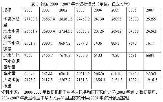 2.5水资源污染严重,威胁粮食的质量安全 统计显示,2003年我国全国废污水排放总量680亿顿(2/3为工业废水,1/3为生活污水),比1980年增加两倍多。约有1/3的工业废水和2/3的生活污水未经处理排人水中,造成82%的河流不同程度地受到污染,其中严重污染的为1/4。农田大量使用化肥、农药,也加剧了水环境的污染。2005年l月份的监测显示,长江、黄河、淮河等七大江河水系劣v类水质占28.4%。水污染已出现由支流向主干延伸、由城市向农村蔓延、由地表水向地下水渗透、由陆地向海域发展的趋势。此外,利用污水灌溉是我国农田污染的主要污染源。被污染的河流水用于灌溉,对土壤环境产生严重的不良影响,威胁着我国的粮食质量安全。 2.6降水量呈历史下降趋势 近几年,我国降水量呈现不断下降的趋势。由表3可知,2000年降水量为60092亿立方米,到2007年,降水量57763亿立方米,减少量约为2329亿立方米。我国大部分水资源主要来源于大气降水,降水量的减少无疑使我国农业水资源紧缺情况更加严峻,对我国部分地区“靠天吃饭”的粮食生产模式收到严峻挑战,甚至危及部分干旱地区的粮食安全。