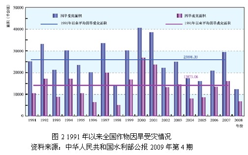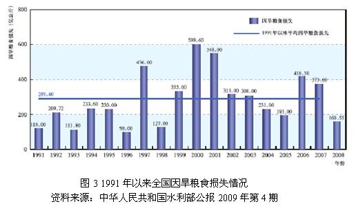 2.7连续干旱加重农业水资源紧缺,造成粮食减产严重 由于水资源的短缺,我国荒漠化干旱十分严重,农业灌溉水危机随着近几年干旱的频繁发生也变得日益尖锐。由于我国70%的粮食产自灌溉区,而农业用水中80%以上又用于耕地灌溉,连年干旱危害农作物生产,威胁着我国的粮食安全。分析1991年以来全国农作物因旱受灾情况(图2)以及因旱粮食损失情况(图3)可知,自1991年到2008年18年来,我国平均因旱受灾面积达25898.35千公顷,占全国耕地面积的21.3%,平均因旱粮食损失达289.4亿公斤。就2009年9月以来我国西南地区遭遇的特大干旱,产粮大省四川的粮食年产量就比上年减少了161.5万吨。我国政府日前发布的《气候变化国家评估报告》指出,近100年来中国的平均气温上升了0.5至0.8摄氏度。如果不采取有效措施,到21世纪后半期,我国的小麦、水稻和玉米等农作物产量最多可能下降37%,粮食安全将受到严重影响。