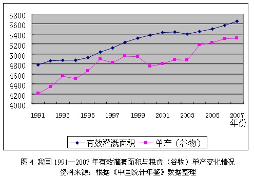2.8粮食增长对农业灌溉的需求 灌溉对粮食增长的作用可以归结为:第一、改变农业生态条件,增加耕地面积,特别是那些除了灌溉就根本不能种植的干旱土地,比如在西北地区,没有灌溉就没有农业。第二、提高作物单产。分析1991—2007年我国有效灌溉面积和粮食单产的变化情况(图4)可知,从全国来看,粮食单产随着有效灌溉面积的增加而增长,粮食单产停滞不前的阶段正好是有效灌溉面积停滞增长的阶段。第三、灌溉能使干旱年份也能有较高的产量,对于降低农业生产的波动性具有重要作用。 我国现有有效灌溉面积58472千公顷,占全国耕地面积的48.0%。据专家预测,在2050年有效灌溉面积将达到我国耕地面积的上限60000~65000千公顷,其中包括10000千公顷的宜农荒地资源的开垦[6]。在采取各种措施提高粮食单产的条件下,使我国有效灌溉耕地的平均粮食单产达到每平方千米1500千克。要达到这一目标,到2050年,平均每十年必须增加约200万平方千米的有效灌溉面积,用水量将从现在的3400亿立方米(2007年)增长到6650亿立方米,可见我国农业水资源十分紧迫,严重影响我国的粮食安全。
