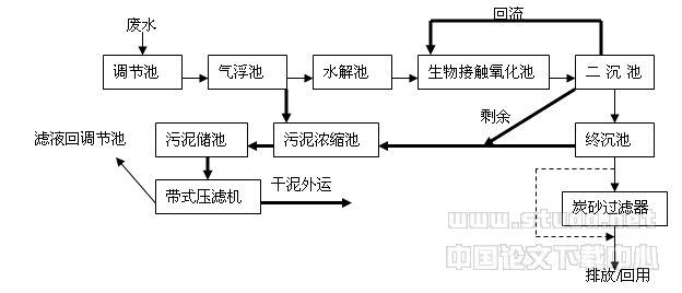 3.颗粒状活性炭在玻璃纤维废水深度处理中的应用 某玻璃纤维生产企业主要产品是IT行业用电子一级玻璃纤维纱、增强型玻璃纤维纱和短切毡等五大类九个品种,近百个不同规格的产品。生产污水主要来自玻璃纤维表面处理工序,水中的污染物质主要是“浸润剂”组分(环氧乳液、PVAC乳液、聚氨酯乳液、润滑剂及抗静电剂、各种偶联剂等)以及微细玻璃纤维等悬浮物。除溶剂外大部分是些热稳定性高、难溶于水的高分子有机物,具有比重轻、颗粒细、可生化性差等物点。设计日排放废水量800吨,采用气浮—接触氧化—炭砂过滤工艺,出水排放执行国家《污水综合排放标准》(GB 8978—1996)的一级排放标准。工艺流程如下: