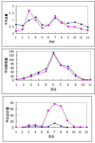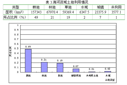 图2. 东沟、西沟降雨、径流、含沙量年内分配对比图 三个图中蓝线表示东沟榆树林站,红线表示西沟啕唻庙站。三个图从上倒下依次为平均流量、平均降雨量、平均含沙量的月变化。可以得出以下几个结论: 1)枯季,东沟比西沟的径流量大。 2)东沟和西沟的降雨量年内分配相似。5~9月的降雨量约占全年的85%,4~9月的降雨量占全年的90%以上。 3)含沙量均以7月最高,该月含沙量西沟明显高于东沟,为东沟的5.60倍。降水比较集中的6~9月,含沙量西沟为东沟的11倍。 由此可见,植被覆盖度的差异会影响到径流的年内分配、河流的含沙量等(东沟森林面积占流域的58%,西够仅为4%;东沟草滩面积占流域面积的34%,西沟没有草滩,夏季,东沟植被覆盖度可达90%,而西沟只有30%)。因此,提高植被覆盖度可以降低河道中的沙石含量,减少水土流失。 1.2潮白河庄户沟小流域治理前后对比分析 再以位于北京市怀柔县汤河口镇的庄户沟小流域为例,通过对该流域的治理,植被覆盖率由45%提高到80%,蓄水保土削减洪峰作用明显,根据东台沟小荒沟等四条沟道六年径流泥沙观测资料计算,全流域土壤侵蚀模数由治理前的1456.4t/km2.a,减少到348t/km2.a,每年可拦蓄泥沙81192.3t。拦沙效益为76.1%,暴雨洪峰径流模数消减了71%,蓄水能力为827.4万m3。有关资料分析得出:大东沟小流域经过综合治理植被覆盖度明显提高,阳坡由30%提高到60%,阴坡由60%上升到95%,土壤侵蚀模数由治理前的1532.6吨/平方公里*年下降到126t/km2.a。 2. 海河流域河道外生态需水定量化研究 2.1海河流域现状土地利用格局 由前面的分析可以得出,植被覆盖度的提高确实会改善水土流失的严峻状况,这里我们将为改善河道外生态环境,植被覆盖度发生变化后的生态补水量称之为河道外生态需水。根据2000年我国1:10万土地利用图1(庄大方,2000)对海河流域的土地利用类型进行统计分析。我们将海河流域的土地利用类型划分为:耕地(水田和旱地)、林地(有林地、灌木林、疏林地及其他林地)、草地(高覆盖度草地、中覆盖度草地、低覆盖度草地)、水域(河渠、湖泊、水库坑塘、永久性冰川雪地、滩涂、滩地)、城镇(城镇用地、农村居民点、其他建设用地)、未利用土地(沙地、戈壁、盐碱地、沼泽地、裸土地、裸岩石砾地等)。在所有统计类型中耕地所占比重最大,近整个流域的一半。这与该区域大力发展农业是分不开的。但由于农田用水属于农业范畴,在这里我们不做讨论。