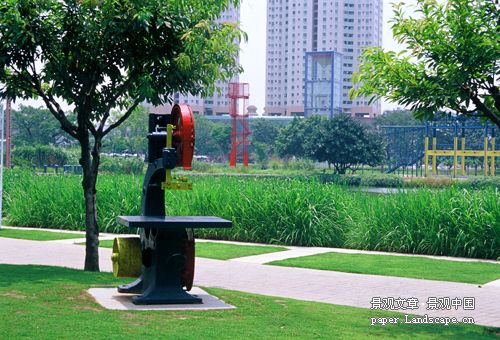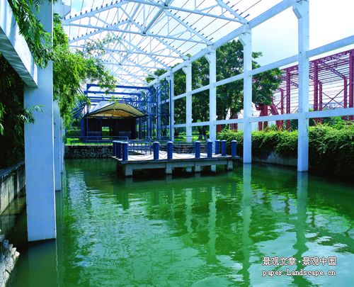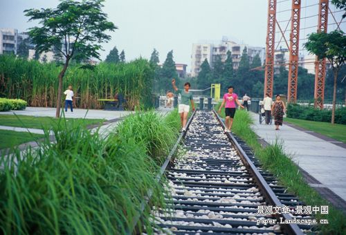中山岐江公园在粤中造船厂旧址上建设,占地11公顷,从1953年到1999年,走过了由发展壮大到消亡的简短却可歌可泣的历程。本案例以产业旧址历史地段的再利用为主旨,对产业旧址及构筑物和机器采用了多种利用方式,在此基础上融入了新的设计形式,并由此引发了对节约型城市绿地设计概念的理解: (1)保留:尊重场地自然与人文印迹。良好的景观不是职业设计师的凭空创造,它们经历时间而发展,创造良好而富有含意的环境的上策是保留过去的遗留。作为一个有近半个世纪历史的旧船厂遗址,过去留下的东西很多:从自然元素上讲,场地上有水体,有许多古榕树和发育良好的地带性植物群落,以及与之互相适应的生境和土壤条件。从人文元素上讲,场地上有多个不同时代船坞、厂房、水塔、烟囱、龙门吊、铁轨、变压器及各种机器,甚至水边的护岸,厂房墙壁上“抓革命,促生产”的语录。正是这些“东西”渲染了场所的氛围。公园设计组对所有这些“东西”以及整个场地,都逐一进行测量,编号和拍摄,研究其保留的可能性。自然系统和元素的保留:水体和部分驳岸都基本保留了原来的形式。全部古树都保留在场地中,为了保留江边十多株古榕,同时满足水利防洪对过水断面的要求,而开设支渠,形成榕树岛;构筑物的保留和再利用:两个分别反映不同时代的钢结构和水泥框架船坞被原地保留,一个红砖烟囱和两个水塔,也就地保留,并结合在场地设计之中;机器的保留和再利用:大型的龙门吊和变压器,大量的机器被结合在场地设计之中,成为丰富场所体验的重要景观元素。 (2)改变:再利用。原有场地的“设计”必竟只反映过去人的工作和生活,以及当时的审美和价值取向,从艺术性来讲,这些与现代人的欲望和功能需求还有一定的距离,还需加以提炼。所以,有必要对原有形式和场地进行改变或修饰。通过增与减的设计,在原有“设计”基础上产生新的形式,其目的是更艺术化地再现原址的生活和工作情景,更戏剧化地讲述场地的故事,和更诗化地揭示场所的精神,同时更充分地满足现代人的需求。岐江公园中几个典型的加法和减法设计包括:旧水塔的利用和改造,烟囱与龙门吊的再利用,船坞的再利用,机器肢体的再利用。除了大量机器经艺术和工艺修饰而被完整地保留外,大部分机器都被选取了部分机体被保留下来,并结合融入到了一定的场景之中。此举一方面是为了儿童的安全考虑,另一方面则试图使其更具有经提炼和抽象后的艺术效果。 (3)再生设计。原场地内的材料,包括钢材、乡土物种等,都可以通过加工和再设计,而体现为一种新的景观、满足新的功能。经过再生设计后的钢被用做铺地材料,乡土野草成为美丽的景观元素。甚至场地的社会主义和集体主义精神也通过诸如“红盒子”的设计而得以再现。