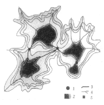 图 1 阻力面与生态安全格局假设模型 Fig. 1 Resistance surface and the schematic model of security pattern 1源 Source,2阻力面和等阻线 Resistance surface and isolines,3源间通道 Inter source linkage,4辐射道 Radiating route,5战略点 Strategic point