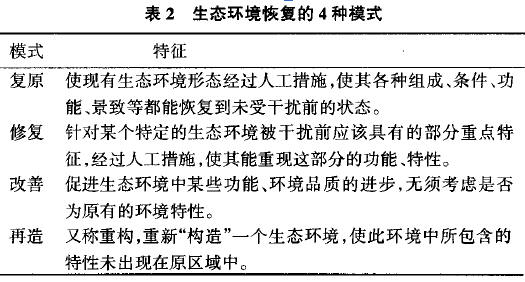 对于河流的自然动态的恢复的重点目标是:① 河流的纵向连通性、水的垂直和侧向交换;② 塑造河渠动态的流量,保证河流最小需水量。 海河河道自然动态恢复的具体措施是: (1)在人类尚未施加约束工程的山区等河段,保持自然流形态,即使在山区土地紧张的情况下,也要保证河道生态用地,保持现有宽阔、蜿蜒的河道,不占用,不裁弯。 (2)利用现有可控的大坝设施调节模拟自然流水,形成河水流量的异质性动态变化。保证河道具有最低水流量基本不干涸。保证河水流量波动,定时补充春旱需水,偶尔的洪水和干旱也是必须的。 (3)在城区修建人工景观河道时设计自然或半自然驳岸,河底自然通透,保证侧向和垂直向水的连通性。在保证安全的前提下,选择拆除一些特定的大坝或砌岸,恢复水的纵向和横向连通性,形成河道构型的复杂性。 (4)在流域尺度上,平原区大的洼地、沼泽要得到一定的恢复和保护,如白洋淀,作为河道的一段异质性区域,它具有维持调蓄水量和生物多样性保护的功能。 3.2 海河流域内生态的恢复 生态环境的恢复有4种模式可以选择,即复原、修复、改善与再造,其特征经整理,列于表2。