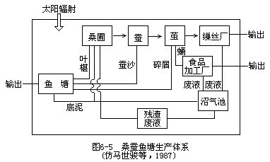 2.水陆交换的物质循环系统 桑蚕鱼塘体系是比较典型的水陆交换生产系统(图6-5),是我国南方各省农村比较多见而行之有效的生产体系。桑树通过光合作用生成有机物质桑叶,桑叶喂蚕,生产蚕茧和蚕丝。桑树的凋落物、桑椹和蚕沙施撒入鱼塘中,经过池塘内另一食物链过程,转化为鱼体等水生生物,鱼类等的排泄物及其他未被利用的有机物和底泥,其中一部分经过底栖生物的消化、分解,取出后可作混合肥料,返回桑基,培育桑树。人们可以从该体系中获得蚕丝及其制成品、食品、鱼类等水生生物以及沼气等综合效益,在经济上和保护农业生态环境上都大有好处。
