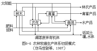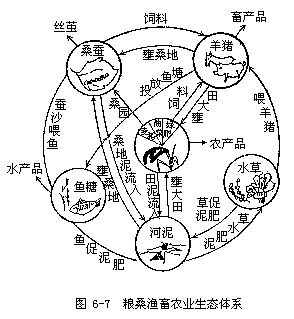 3.农林牧渔联合生产系统 图6-6是农、林、牧、渔生态系统的初级生产模式。这个体系中四个亚系统进行物质和能量交换、互为一体。林区保护农田,为农田创造良好的小气候条件,同时招引益鸟捕食农林害虫。作物籽粒及秸秆为禽畜提供精粗饲料,而禽畜的粪便又为农田提供有机肥料,或为鱼池提供肥水。鱼池底泥上田作肥料。物质与能量得到充分的利用,能够实现林茂粮丰、禽畜兴旺、水产丰收,得到较高的经济效益和生态效益。此外,在浙江杭嘉湖平原水网地区建立的以粮桑渔畜为主体的种植业、养殖业、加工业相结合,农林牧副渔全面发展,农工副综合经营的农业生态系统(图6-7),对当地的农业生产的发展起了积极的作用。 |