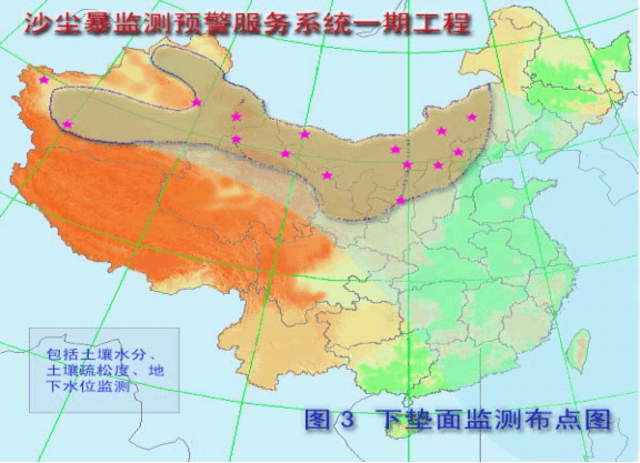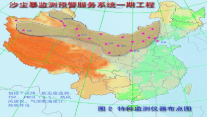 (二)近地层大气气溶胶物理化学特性监测 l在乌鲁木齐、和田、哈密、铁干里克、敦煌、酒泉、民勤、兰州、额济纳旗、乌拉特中旗、锡林浩特、朱日和、东胜、银川、西安、延安、张北、大同、北京、天津等20个站增加干沉降、能见度仪、TSP、PM10、气溶胶浊度计、热红外仪等观测项目。  (三)大气边界层探测 • 西北、华北各设一部微脉冲激光雷达。 在和田、哈密、乌鲁木齐、敦煌、酒泉、民勤、兰州、东胜、朱日和、银川、延安、西安、大同、张北、北京天津梯度观测塔观测。 (四)下垫面监测 l在和田、哈密、乌鲁木齐、敦煌、酒泉、民勤、兰州、东胜、朱日和、银川、延安、西安、大同、张北、北京等15个站增加土壤水分、土壤疏松度及地下水位监测项目。  主要观测仪器的作用 利用太阳光度计,实时观测多谱段太阳辐射资料,反演出大气光学厚度。 利用激光雷达对大气中沙尘气溶胶的分布和移动路径上的情况进行监测。 利用热红外仪测量大气亮温,反演出空中沙尘的浓度和温度。 利用能见度仪和气溶胶浊度仪,测量因沙尘气溶胶而导致的大气辐射散射特性的变化。 利用空气悬浮颗粒物监测仪,测量空气中单位体积中悬浮颗粒物质量浓度。同时利用称重天平等设备,测量固定时间、固定的地表面积空气中沉降的沙尘总量的质量,可间接反映空气中沙尘含量和沙尘输送的情况。 通过对干沉降的化学分析可测量空气中沙尘物质的各种重要化学元素的含量和富集程度,从而实现对沙尘天气的溯源分析,为治沙防沙提供科学依据。 • 利用土壤水分监测仪,监测0-200厘米不同深度土壤含水量;利用土壤疏松度计测量土壤硬度;结合地下水位情况监测获得地表土壤及一定深度土壤的水分特征,对土壤干旱情况进行有效的监测,为分析沙尘暴发生成源地的基本条件和沙尘移动路径中的地表起沙的条件提供准确的依据。 • 利用卫星遥感等技术,有效监测地表植被情况,结合下垫面旱情及气象要素以及气象环境观测项目的探测、分析,实现对沙尘暴天气的预报和预测。 警服务系统建设内容 • 建立国家、省、地分布式沙尘暴专业实时资料数据库。 • 建立各类探测资料同化处理系统。 • 建立沙尘暴天气中尺度数值预报业务模式。 • 建立沙尘暴事实预报、预警业务系统。 • 建立沙尘暴综合评价和服务系统。 • • 项目建设进展情况 • • 通过对专门选定的60多个气象台站监测的风、能见度、辐射等气象参数进行分析,获取与沙尘暴产生、发展、路径和消亡的相关因子; • 已基本完成沙尘暴监测站点选址和仪器设备的订购事宜,正在进行太阳光度计和气溶胶监测仪等关键设备的安装调试工作; • 以上参数和设备已在近期沙尘暴监测预警中发挥了重要作用。 • 完成了沙尘暴监测技术培训,为做好沙尘暴的监测预警工作打下了良好的人员和技术基础。