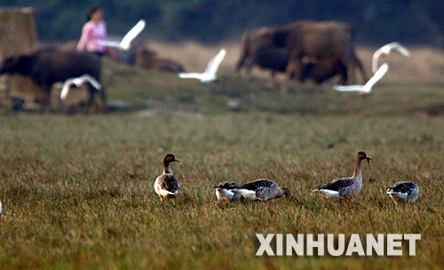 在海南东寨港湿地,几只国家二级保护动物灰雁(前立者)在觅食(2007年12月19日摄)。 海南岛四周海岸有大面积的沿海滩涂,中部山区有茂密的原始热带雨林,良好的湿地生态为鸟儿们提供了理想的生活环境。 新华社记者 姜恩宇 摄 它是“地球之肾”、 是“鸟的天堂”、是令人心驰神往的“仙境”、是充满诗情画意的地方。它就是与森林、海洋并称地球三大生态系统的湿地。 “湿地”,泛指暂时或长期、天然或人工的覆盖水深不超过2米的低地、土壤充水较多的草甸、以及低潮时水深不过6米的沿海地区,包括各种咸水淡水沼泽地、湿草甸、湖泊、河流以及泛洪平原、河口三角洲、泥炭地、湖海滩涂、河边洼地或漫滩、湿草原等。 湿地过滤大地有害物质,养蓄有益物质,供给河流以源泉,控制洪水和防止土壤沙化,以有机质的形式储存碳元素,减少温室效应,保护海岸不受风浪侵蚀,提供清洁方便的运输方式……堪称“地球之肾”。 湿地复杂多样的植物群落,为野生动物尤其是一些珍稀或濒危野生动物提供良好的栖息地,为各种鸟类提供丰富的食物来源和营巢、避敌的良好条件,是鸟儿们的“天堂” 湿地也是“诗地”。《诗经》中“关关雎鸠,在河之洲,窈窕淑女,君子好逑……”写的是湿地;“蒹葭苍苍,白露为霜。所谓伊人,在水一方……”写的也是湿地。 古人常讲“天人合一”,人居环境关乎人类的生命。当围湖造田、围海造地、截留水源、滩涂开垦比比皆是;非法猎杀、捕捞、采挖屡禁不止;大地的肾脏被人类粗暴地割开一道道伤口。全球变暖气候异常,使我们能够保持自然清新的环境的湿地,离我们近在咫尺又那么遥远…… 《湿地公约》规定每年2月2日为世界湿地日。 2008年世界湿地日主题为“健康的湿地,健康的人类”。 作为世界上湿地资源丰富的国家之一,中国目前已建立湿地自然保护区470多个,已有45%的自然湿地得到有效保护,并有30块湿地列入国际重要湿地名录。