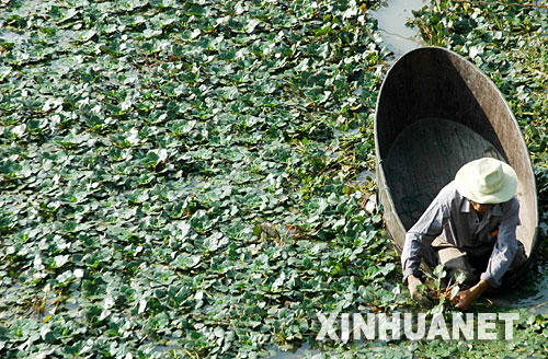 2007年9月21日,安徽巢湖渔民在巢湖里采菱角。 巢湖渔民在封湖禁渔期间,在湖边湿地大量种植菱角,此举不仅改善了巢湖湖滨生态景观,有利于水质改善,还增加了渔民收入。 新华社发(徐振华 摄)