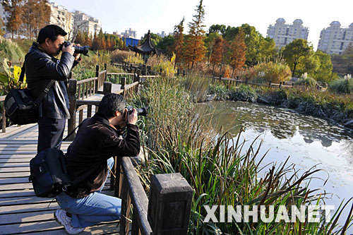 2007年12月5日,两位摄影爱好者在上海徐汇区康健公园一块面积近两千平方米的人工生态湿地内拍照。湿地内的芦苇、木栈道和各类水生植物相映成趣,吸引众多申城市民。 新华社记者 裴鑫 摄