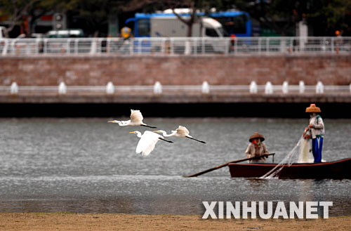 几只大白鹭在三亚市中心的三亚河上与人们和谐相处(摄于2007年1月20日)。 海南岛四周海岸有大面积的沿海滩涂,中部山区有茂密的原始热带雨林,良好的湿地生态为鸟儿们提供了理想的生活环境。 新华社记者 姜恩宇 摄