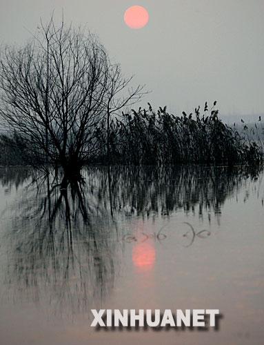 2008年1月6日清晨,安徽省淮北市东湖湿地公园,一轮红日冉冉升起。 近年来,当地政府对湿地资源加大保护力度,严禁捕猎野生动物和鸟类,成果斐然。如今湖面摇曳生姿的芦苇和飞翔的鸟类已经成为当地秀丽的景致。 新华社发(徐振华 摄)