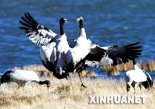 黑颈鹤在大山包乡大海子村的湿地里嬉戏(2007年12月12日摄)。 大山包位于云南昭通市昭阳区西部,海拔约3100米、年平均气温6.2摄氏度,是被誉为“鸟类熊猫”的黑颈鹤的越冬地。 新华社记者 邹峥 摄