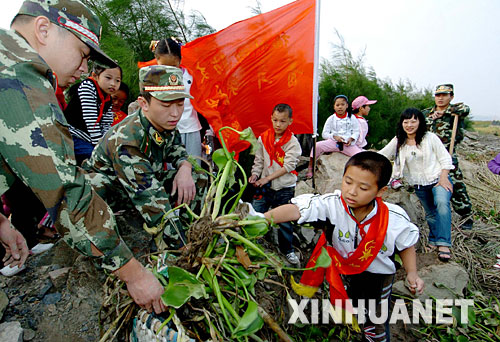 2007年10月16日,驻守福建省长乐市的公安边防官兵和当地小学生一起来到闽江口湿地周边清理海漂垃圾,迎接候鸟越冬。据介绍,位于福建省长乐市闽江口的500公顷湿地是重要的候鸟迁徙通道,每年在此过境和越冬的候鸟达10万只以上。 新华社记者 张国俊 摄 |