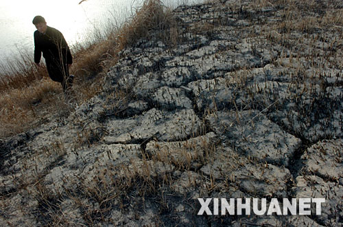 在郑州花园口黄河湿地内大面积的湿地植被被烧毁、土地被烧焦(2006年2月24日摄)。 位于郑州黄河花园口段的黄河滩区内约10万亩临河滩地1998年被当地政府确定为湿地自然保护区。自2005年起,湿地保护区管理部门和当地政府在湿地流域的管辖权问题上产生分歧,使湿地管理失控,周边群众非法圈占湿地进行开垦种植、建设鱼塘、非法采沙,黄河湿地生态环境遭到严重破坏,数千亩植被被烧毁,令人触目惊心。 新华社记者 朱祥 摄