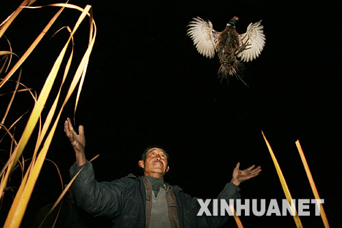赵德连老人在湿地放生闯到渔网里的山鸡(2007年11月10日摄)。 赵德连老人从2000年开始承包淮北采煤塌陷区里的水面养鱼,同时也开始了义务护鸟的历程。在赵德连老人的努力下,如今这片湿地已经是鱼跃鸟鸣,生态和谐。