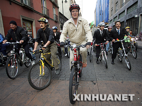 2007年4月2日,为在墨西哥城推广使用自行车,墨西哥首都墨西哥城市长马塞洛·埃夫拉德(中)带头骑自行车上班。汽车的普遍使用是导致温室气体大量排放的重要原因。 环境恶化、气候突变、冰川消融、海面上升……这些并不只是少数人才应该担忧的问题,地球家园与我们每一个人息息相关。在环境问题日益严峻的今天,我们是否应该静下心来想一想,还能做些什么以拯救地球和我们自身?