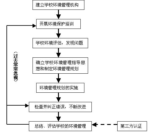 二、 ISO14000系列标准与学校环境管理 1. ISO14000系列标准 ISO14000系列标准是国际标准化组织(ISO)在1992年联合国环境与发展大会之后,为适应人类社会可持续发展的需要,制定的旨在规范全球工业、商业、政府、非盈利组织和其它用户的环境行为,减少人类活动对环境造成污染和破坏,进一步促进经济与环境的同步协调发展的系列标准。与人们所认识的一般标准不同,ISO14000标准是针对组织环境管理而制定的,国际标准化组织为其预留了100个标准号。该标准的特点包括自愿性、灵活性(未设置绝对量)、全员参与、全过程管理及对相关方提出要求、持续改进性等。 在ISO14000系列标准中,ISO14001标准是主体标准,它规定了组织建立、实施并保持环境管理体系的基本模式和17项基本要求,即通过建立一套机制,确定组织的环境方针和目标等,对环境管理体系不断完善来实现组织环境绩效的持续改进。[2] ISO14000系列标准的实施需要对组织成员进行培训;识别环境因素和评价重要环境因素并加以控制;确立组织的环境方针;建立相应的机构;编制相关环境管理体系文件等,在组织内部建立环境管理体系并运行所建立的体系,发现不符合之处并给予纠正,以实现组织的环境绩效持续改进。组织在运行、完善建立的环境管理体系后,可以申请第三方认证。在我国,越来越多的企业为适应“入世”需要,积极开展认证工作,可以说,这是一个进入国际大市场的通行证。同时,ISO14000系列标准并不仅仅针对企业,它适用于任何组织。一个组织,通过建立环境管理体系,可以提升其环境管理水平,有利于树立组织良好的社会形象,所以,我国的一些政府机关也开展了这项活动,如天津市环保局就已通过了环境管理体系的认证。