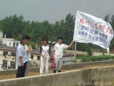 农村饮用水安全是新农村建设的重要内容。近日,扬州大学水利学院 “农村饮用水安全宣传调查”暑期社会实践小分队一行8人来到江苏省宿迁市宿豫区晓店镇,开展了以农村饮用水安全为主题的调研、考察和宣传。他们走进普通农户家庭,走访当地自来水厂,向村民们发放资料,宣传饮用水安全使用常识,积极引导广大村民珍爱健康,保护水资源。 |