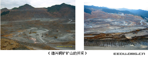 在参观了大规模地露天开采德兴铜矿的采矿区和选矿区后,最让我感受深刻的是矿产宏大的开采规模以及最让我担忧的是矿产有限的开采程度。在山顶可以看到矿山被开采的深度,据矿区的工作人员给我们介绍,20世纪80年代开始,此矿的日开采量为9万吨, 到现在的日产量达到20万吨。铜矿资源是铜矿业发展的基础,又是不可再生资源。为了实现矿业的可持续发展,铜矿也提出了他们考虑到的两个关键方面:一是适度开发,均衡生产;二是提高资源利用率,珍惜与合理利用矿产资源,实行"开发与保护并重"的方针,实行"有出有进、以出养进"的方针。