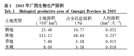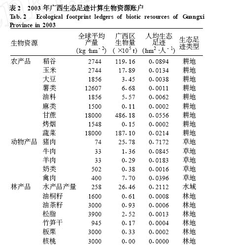 生物资源生产面积折算的具体计算中采用联合国粮农组织1993 年计算的有关生物资源的世界平均产量资料。将2003 年广西的消费转化为提供这类消费需要的生物生产面积(表2) [1 ] 。