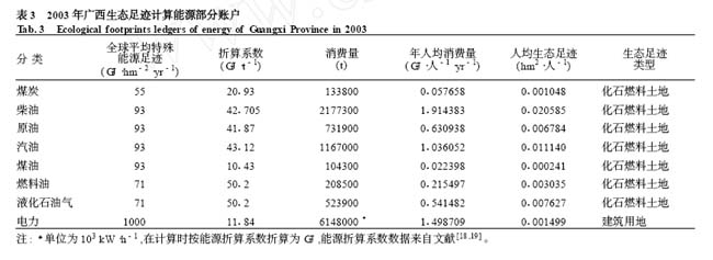 能源平衡账户的计算采用世界上单位化石燃料生产土地面积的平均发热量为标准,将当地能源消费所消耗的热量折算成一定的化石燃料土地面积(表3) 。其中,广西2003 年的总人口为4 857 万人[1 ] 。