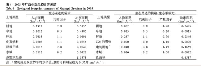 表4 为整个广西地区生态足迹的总结部分,由生态足迹的需求和能供给的生物生产土地面积2 部分组成。