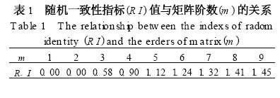判断矩阵一致性指标CR = CI/RI , 式中RI 为平均随机一致性指标, 与矩阵阶数有关(表1) , CI=(λmax-n)/(n- 1)。当完全一致时, CR = 0; CR 越大,矩阵的一致性越差, 一般而言, 若CR < 0.1, 则认为判断矩阵是可接受的, 否则就需要调整判断矩阵[ 3 ]。