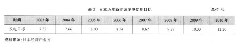 其中规定电力销售业者必须利用一定比率的新能源(如风能、太阳能、生物质能、地热能等)及不超过1万千瓦的小水力进行发电。RPS制度推行后,2003年度日本新能源发电设备供给总量达4014.1万千瓦;其中,太阳能发电1472万千瓦、风力发电989.9万千瓦、中小水力发电838.2万千瓦、生物质能发电2038.8万千瓦。表2为日本对新能源发电占总发电量的使用目标百分率。