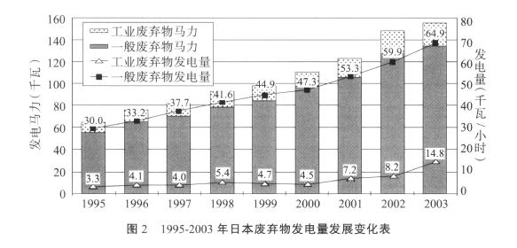 废弃物一般分为以城市垃圾为主的一般废弃物和工厂等排出的产业废弃物两类。2003 年末日本废弃物发电利用情况是,一般废弃物发电厂257 家,发电总装机容量134.9 万千瓦;产业废弃物发电厂65 家(造纸业除外),发电总装机容量155.3 万千瓦。图2 是1995一2003 年日本废弃物发电量发展变化情况,从中可以看出日本在废弃物发电方面所取得的进展。目前东京正在准备建设国内最大的垃圾发电厂,设计垃圾处理能力每天为110 吨,相当于73 万人排出的垃圾量,可供2420 户用电。日本2010 年废弃物发电的导入目标是417 万千瓦。