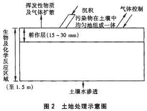 土壤中的许多好氧细菌能利用各种有机物作为食物及能源,其他微生物则产生一些酶,将污染物部分分解,最终达到降解污染物的目的。生物吹脱系统在设计时有时采 用单独的空气注入井(如图1中a所示);有时和空气回收井共同使用(如图1中b所示);若 要加快生物降解速度,可以将回收井放在污染最严重的地区,并且采用较低的空气流速(如图1中c所示)。 生物吹脱法是将污染物分解而不是将其转移到其他介质中,因此它的突出特点是不需要尾气 处理装置。在大多数现场处理中,每口井费用为2000~5000美元。若包括空压机、控制器 、电器、设备室、保障设备等,每口井费用则为20000~50000美元。若采取尾气处理工艺,处理费用将由13美元/m3升高到52~78美元/m3。 2 土地处理技术 土地处理是将废物、污泥或污染土壤置于未污染土壤的表面,通过种植作物或翻耕将这些物 质混入土壤,污染物在土壤中经过水解、光解、化学降解、生物降解等作用最终得以去除。 现场土地处理能生物降解有机废物,固定无机废物,并能避免废物的生物累积,以免威胁人 类健康及环境。土地处理系统如图2所示。