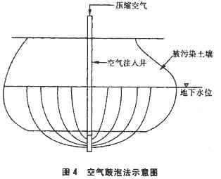 在污染地区注入压缩空气和营养盐,微生物在含有营养盐的富氧地下水中通过新陈代谢作用 将污染物降解,在地下水流向的下游地区用泵将地下水抽出地面,可以用其溶解营养盐后再 回灌到地下水中,若需要时也可对其进一步进行处理。 液体输送技术的优点如下: ①避免挖掘土方工程; ②可以处理沉积物吸附和夹带的污染物; ③避免污染沉积物的迁移。 液体输送技术的缺点如下: ①对场地有特殊要求(只有在K值大于10-4cm/s的场地才能使用),且土壤中孔隙极易堵住,需要更长的时间处理污染物; ②污染物浓度高时,会阻碍生物恢复的进行; ③产生的地下水不能循环利用,很难得到排放许可。 液体输送技术可处理溶解态污染物和沉积物中夹带的污染物。污染物的类型、数量、范围是决定费用的主要因素。系统设计时应提供足够的氧气和营养物给可降解污染物的微生物,因此氧气的来源将影响处理费用。使用H2O2作氧源比氧气贵得多,但需要在很短时间内处理污染物时,利用H2O2作氧化剂则总费用可能降低。 地下水中原有微生物有利于污染物的降解。微生物的相对数量取决于沉淀特性、污染物的类型和浓度、营养盐。使污染物降解速度最大的无机营养物种类和浓度的研究正在进行,但在营养物添加方案正式提出前,要考虑地面下存在的天然营养物,如氮、磷和微量元素镁和锰。例如某地汽油泄漏,以H2O2作氧源,采用液体输送技术进行处理。15周后注入井周围的石油烃类浓度下降很快,由原来的31mg/L降至5mg/L;35周后周围 地区石油烃类浓度均降至2mg/L以下,表明生物恢复措施已经成功。 4 空气鼓泡技术 空气鼓泡是将空气引入饱和地区,以便将挥发性物质转移到非饱和地区进行生物降解。当空 气在许多通道中向上向外流动时,挥发性物质转移到非饱和地区,被土壤吸附并被微生物降 解。空气注入井通常位于含水层的底部,如图4所示。