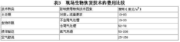 饱和地区空气鼓泡处理化合物的机理取决于生物降解的相对容易程度及其从含水层中去除的 相对容易程度。生物降解的程度取决于污染物性质、场地特征及系统的设计。由于含水层土壤条件的差异,进行场地实验并借鉴其他场地的数据来设计安全可靠的生物恢复系统是非 常必要的。由于向饱和地区注入空气可以赶走水,因此可以利用地下水回收系统阻止溶解性 污染物的转移,一部分回收的水可以用于溶解营养盐并回注入水中。地下水回收与再利用的 另一个好处是有利于水在空气通道之间运动,以增加溶解氧在水中的运动。 污染物从含水层中去除的相对容易程度取决于化合物的水溶性、蒸气压和在含水层中的物理 状态(溶解态、自由态、吸附态)。溶解态化合物如果有很低的水溶性和很高的蒸气压,则它们容易被转移。溶解态化合物被转移的趋势与化合物亨利常数有直接关系,亨利常数大于1×10-3m3/moL的化合物转移到气相的趋势很明显。许多亨利系数相对高的化合物(例如苯),在好氧条件下容易生物降解,但并不能轻易地通过挥发去除掉。 非饱和地区的空气鼓泡需要很高的空气注入速度,以克服地下水的水头压力和表面张力。严格控制空气注入速度以防止挥发物转移到大气中是非常必要的。当处理场地中包含非饱和地 区时,土壤体积和能降解污染物的微生物数量都比饱和地区含有的多。在渗透力很好的非饱 和地区,供给营养物质将比饱和地区容易得多。溶解氧在含水层中的分布通过扩散、空气运 动、地下水运动而实现,在液体输送中,由于空气在水中溶解度低而限制了氧气的传递速率 ,H2O2在水中能部分溶解,常用做氧源。使用H2O2达到的氧气传递速率比通过鼓泡 可能得到的速率要高,并且能成功地使含水层得以生物恢复,但缺点是费用高。在含水层直 接鼓入空气提供了一种有潜力的科技手段,并且比液体输送引入氧的方法有更好的费用—效益值。 用空气鼓泡法引入水中的氧气比其他技术获得的氧气量要大,离空气管道非常近时才有可 能维持溶解氧接近饱和值。采用空气鼓泡的生物恢复系统和使用H2O2作氧源的系统相比,前者注入井的数量很多且间隔很近,许多实践者认为这样做可在饱和地区得到更多的氧气。在完全污染地区的处理过程中,空气鼓泡引入的氧气比依赖污染地区氧传递的方法要好,它可使场地中的许多地点都具有相似的生物恢复速率,与液体输送中生物降解速率随前沿向场地移动的现象相反。 5 费用比较 治理地下水和土壤污染的各种现场强化生物恢复技术的处理费用见表3。