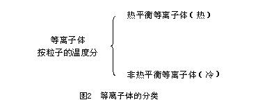(二)等离子体的分类 按粒子的温度等离子体可分为两大类,热平衡等离子体(或热等离子体) 与非热平衡等离子体(或冷等离子体),如图2所示。 冷等离子体的特征是它的能量密度较低,重粒子温度接近室温而电子温度却很高,电子与离子有很高的反应活性。相对地,热等离子体的能量密度很高,重粒子温度与电子温度相近,通常为10000K 至20000K 的数量级,各种粒子的反应活性都很高,本文后面所提到的等离子体如未特别说明即指热等离子体。