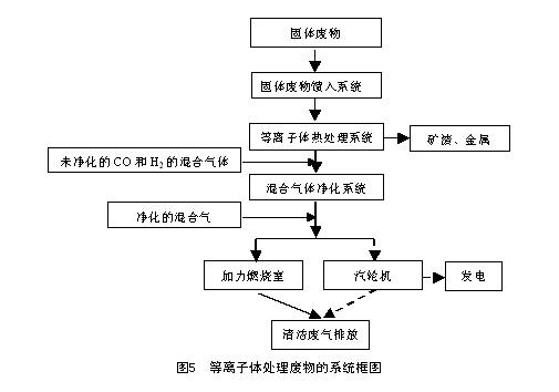 值的商业气体,可应用在多种制造日用品的工艺中,例如:氨及塑料、药物、维生素、食油等。它亦可为燃料电池提供能量。燃料电池被广泛认为是未来解决污染问题的洁净能源。从无机废物中得到的可再用的产品包括可用于冶金工业的合成金属,可用于建筑及研磨材料的玻璃状的硅石。 图5是等离子体处理废物的流程示意图,在等离子体热处理系统中,主要设备是两台等离子体火炬,即第一气化室和第二气化室。 在处理废物时,垃圾首先被切碎并注入第一气化器(如图5所示等离子体热处理系统)。工作温度在1800-1900K,300KW。减容比高:90%甚至95%以上。产生的等离子体火炬可以很快使有机物分解成一氧化碳和氢,无机物则变为玻璃状的硅石。 第二气化室(图5中的加力燃烧室)等离子体火炬可对第一气化室中合成气体中的一些残留微粒和一些碳氢化合物再进一步进行分解处理。 通过第二气化室处理后的混合气体经过净化系统后,成为只含H2和CO的混合气体,加力燃烧室在1000○C温度环境下对H2和CO的混合气体进一步进行处理,以确保无有害的混合物产生,比如二氧芑和呋喃等,最后排放到空气中。当然也可以取消加力燃烧室而利用这些混合气体去驱动汽轮机发电。 在第一气化器中垃圾的无机物部分熔化成玻璃状的无污染的炉渣如图6,炉渣可安全用于建筑材料,根据不同的用途,炉渣可复原为各种形式。