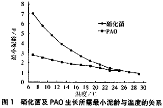 之所以在图1中列出硝化菌生长所需的最小泥龄是因为硝化反应会对PAO生长产生不利影响。若在好氧段发生硝化反应,硝酸盐会随着回流污泥进入厌氧段,使得反硝化细菌同PAO争夺VFAs,从而破坏了PAO的选择性优势。另外,回流到厌氧段的硝酸盐还会 干扰发酵反应,因为反硝化细菌在厌氧条件下会直接利用易降解有机物(1mgNO3-N回流到厌氧段大约有6mgCOD被消耗掉),从而破坏了其通过发酵反应转化为VFAs的过程。因此,当好氧段发生硝化反应时确定厌氧段泥龄应考虑到由此引起的有机物的额外需求。从图1可以看出,当温度较低时PAO和硝化菌生长所需的最小泥龄相差较大,设计或运行时很容易使系统满足PAO生长而抑制硝化菌的生长,但随着温度的升高两者逐渐接近(>25℃时两者相等)。VIP、UCT工艺由于能去除回流液中的NO3-N而使PAO具有明显的优势。