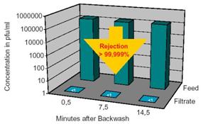 膜组对病毒和MS2噬菌体的去除能力是很难测定清楚的。这是由于膜组超强的过滤能力使得被膜阻隔下来的高浓度的噬菌体需要长时间的药物清除。技术上所能达到的指标是每升含有10万个噬菌体的浓度,但是膜组的去除噬菌体浓度却高于这个指标,所以我们已经很难通过技术指标来确定膜组除菌的能力了。经测,MS2噬菌体通过膜组后,它的减少量大于99.999%(5log)。
