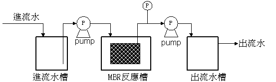 2.設備與方法 本實驗以MBR模型廠進行LCD有機廢水實驗評估,圖1為流程示意,廢水從均勻池抽送至進流水槽,再從進流水槽以定量幫浦將廢水送入MBR反應槽,處理水流經薄膜以真空幫浦進行吸取,再將處理水送至出流水槽。反應槽有效體積為140L,薄膜材質規格如表2中所示。植種污泥源來自工研院化工所SBR之濃縮污泥,濃度約8,000mg/L,使MBR反應槽MLSS濃度初期維持在8,000mg/L左右。