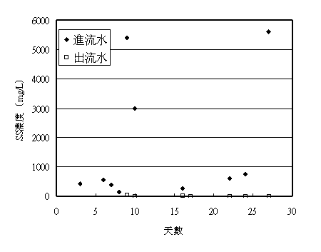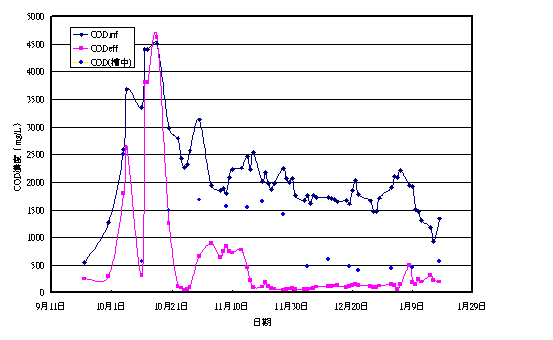 3.結果與討論 本實廠操作至今約2個月,出流水水質良好,尤其SS低於偵測值。依據處理結果,討論說明如下: 4.1 COD與SS濃度變化 如圖5中所示,進流水COD濃度介於300~1,600mg/L之間變化,平均濃度約為1,000mg/L,經過MBR處理後,其出流水COD濃度介20~80mg/L之間,平均濃度43mg/L。從圖中COD濃度變化得知,雖然進流水COD濃度變動範圍大,但均能達到良好的出流水質,顯見MBR技術對環境變異的忍受性強。另即使進流水SS濃度很高,由於薄膜之過濾功能,出流水SS均達到低於偵測值之效果。由於出流水質佳,出流水具有回收再利用之潛力,在目前水源缺乏之狀況下,本技術更具有實用價值。 圖5 MBR模型廠COD濃度變化